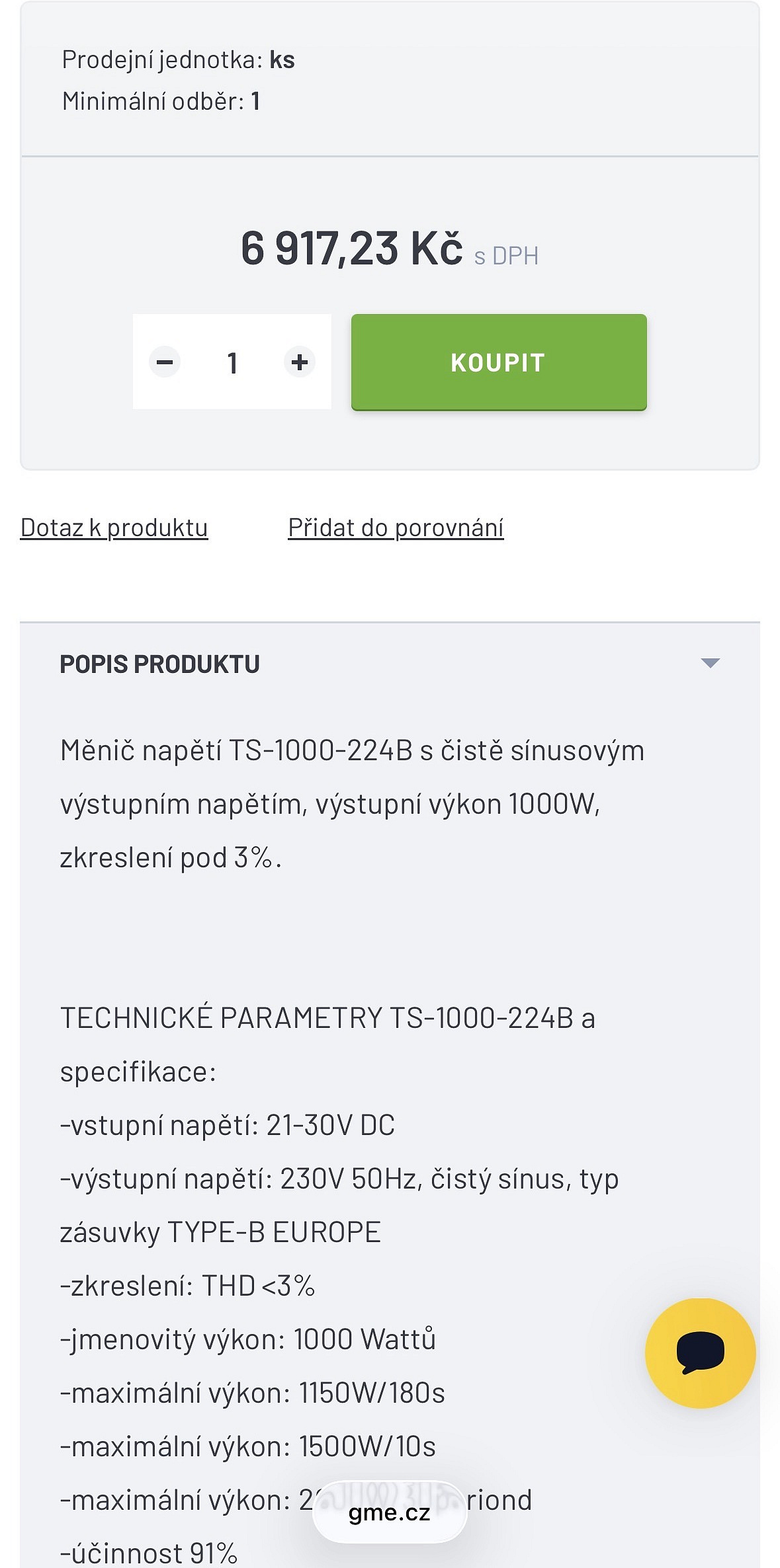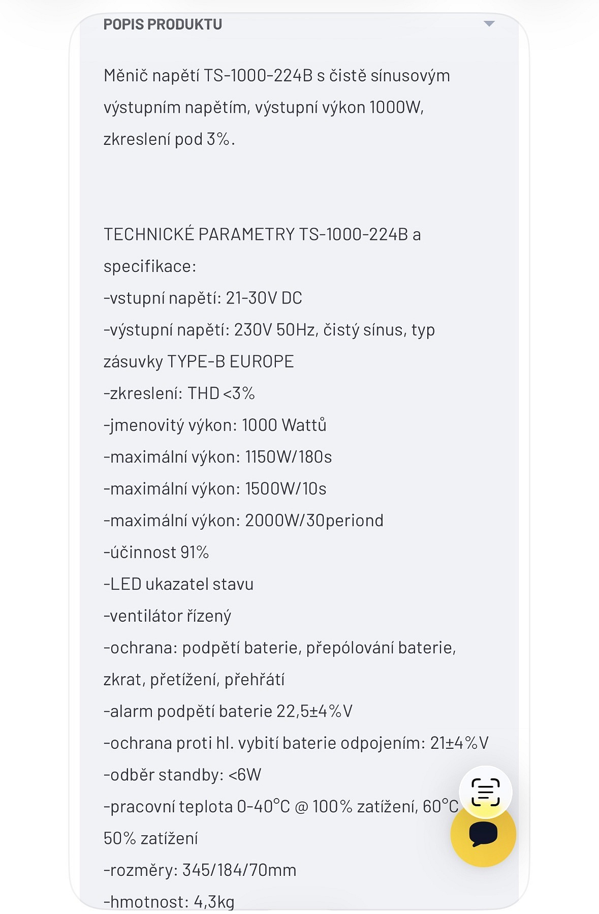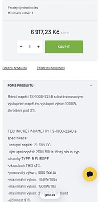 • určen pro převod 24 V DC na 230 V AC, čistý sinusový výstup, trvalý výkon 1000 W