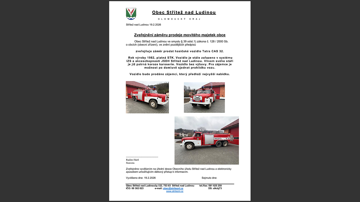 Obec Střítež nad Ludinou zveřejňuje záměr prodat hasičské vozidlo Tatra CAS 32.